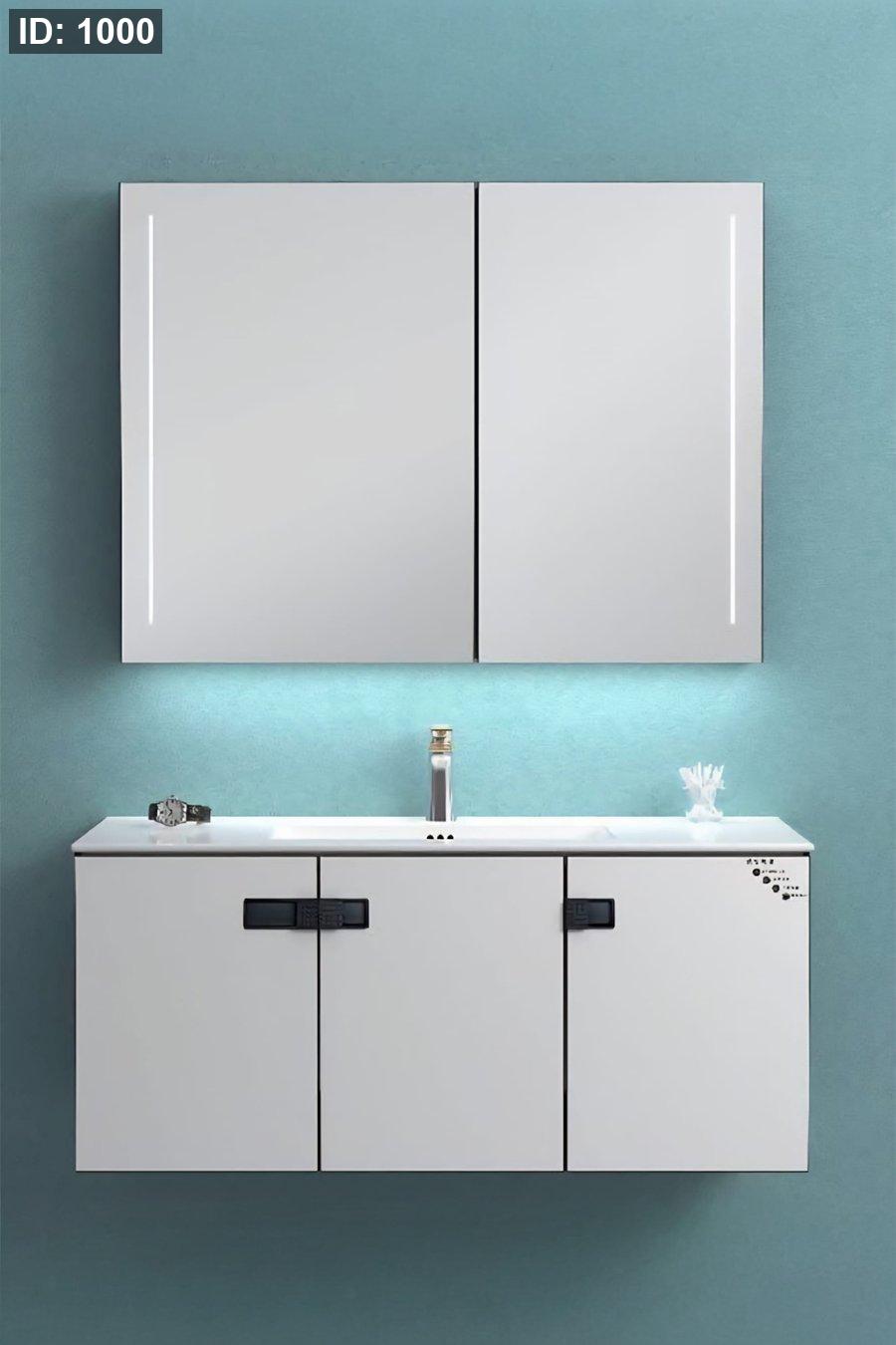 يشمل: خزانة مغسلة، سطح مع مغسلة مدمجة، خزانة مرآة بإضاءة LED مزدوجة (أمامية وسفلية)