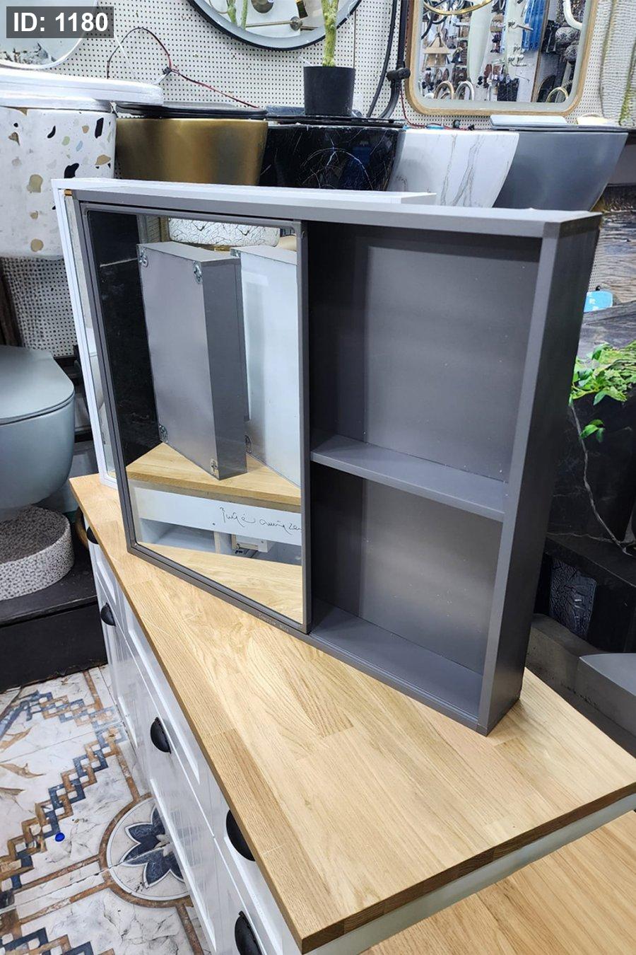 خزانة حمام معدنية باللون الرمادي مع مرآة أمامية