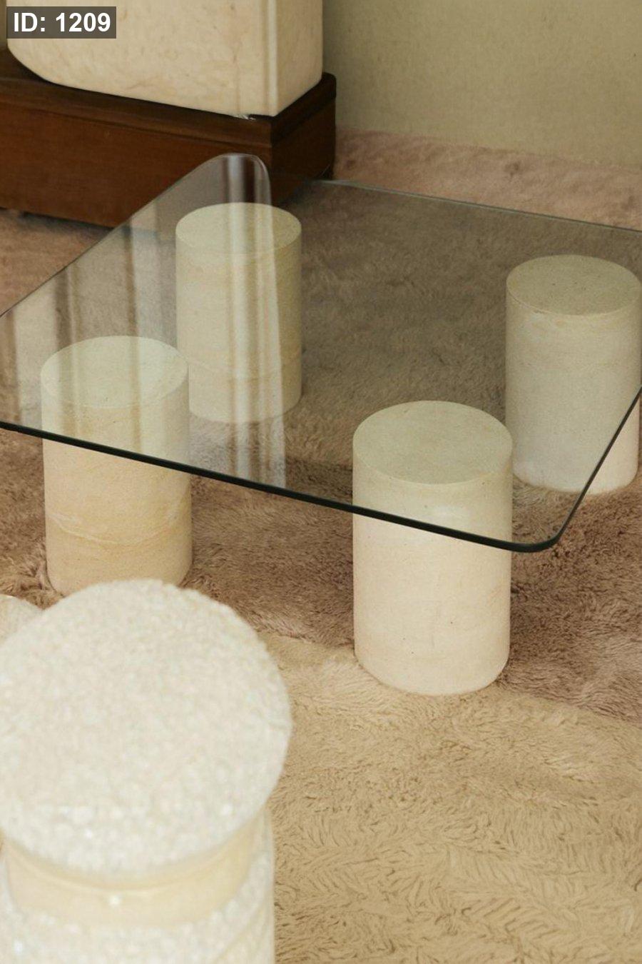 أربع قواعد أسطوانية من الحجر الطبيعي بلون بيج فاتح.