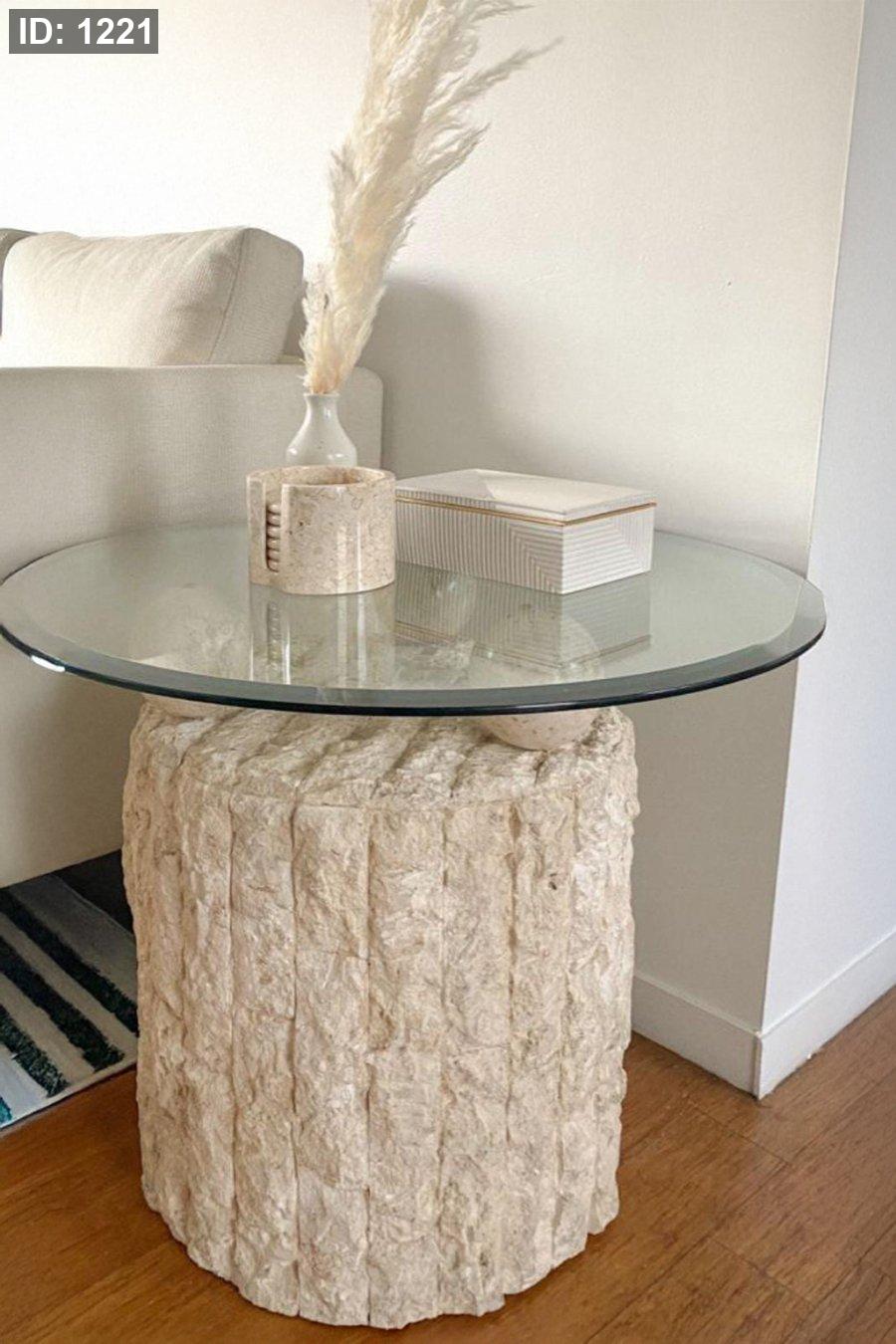 سطح زجاجي دائري أنيق مع قاعدة بتصميم خشن طبيعي.