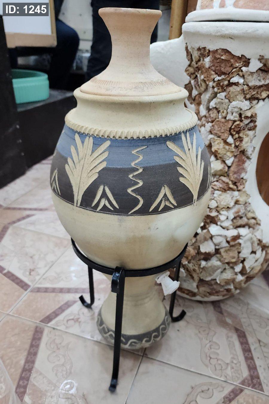 فخّارة فخارية بنقوش يدوية وقاعدة معدنية
