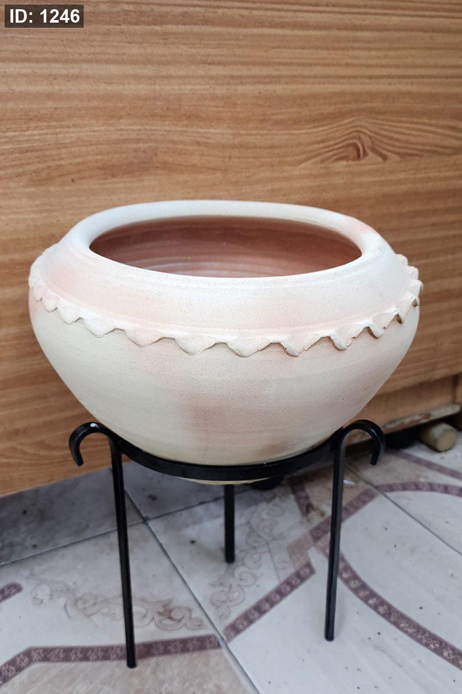 قصرية فخارية عريضة بحواف زخرفية وقاعدة معدنية