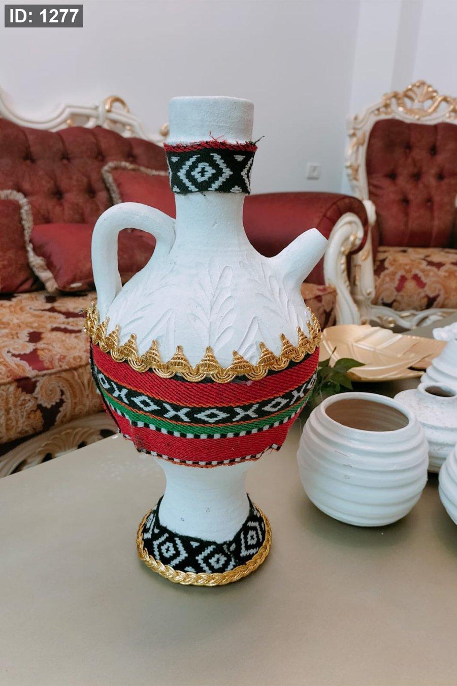 إبريق فخاري أبيض مزين بالنقوش البدوية