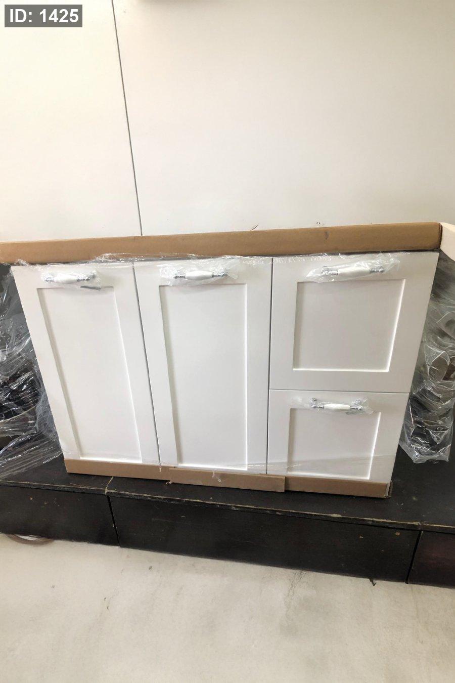خزانة أنيقة بتصميم كلاسيكي باللون الأبيض، تجمع بين البساطة والأناقة لتضفي لمسة ترتيب ونظافة على الحمّام.