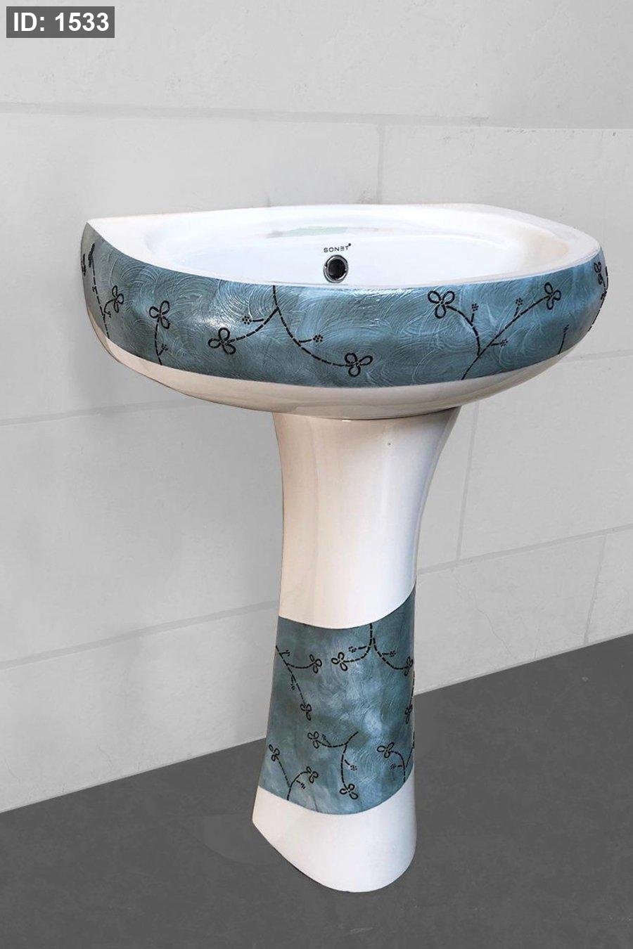 مغسل سيراميك مع عمود – نقش أزرق أنيق