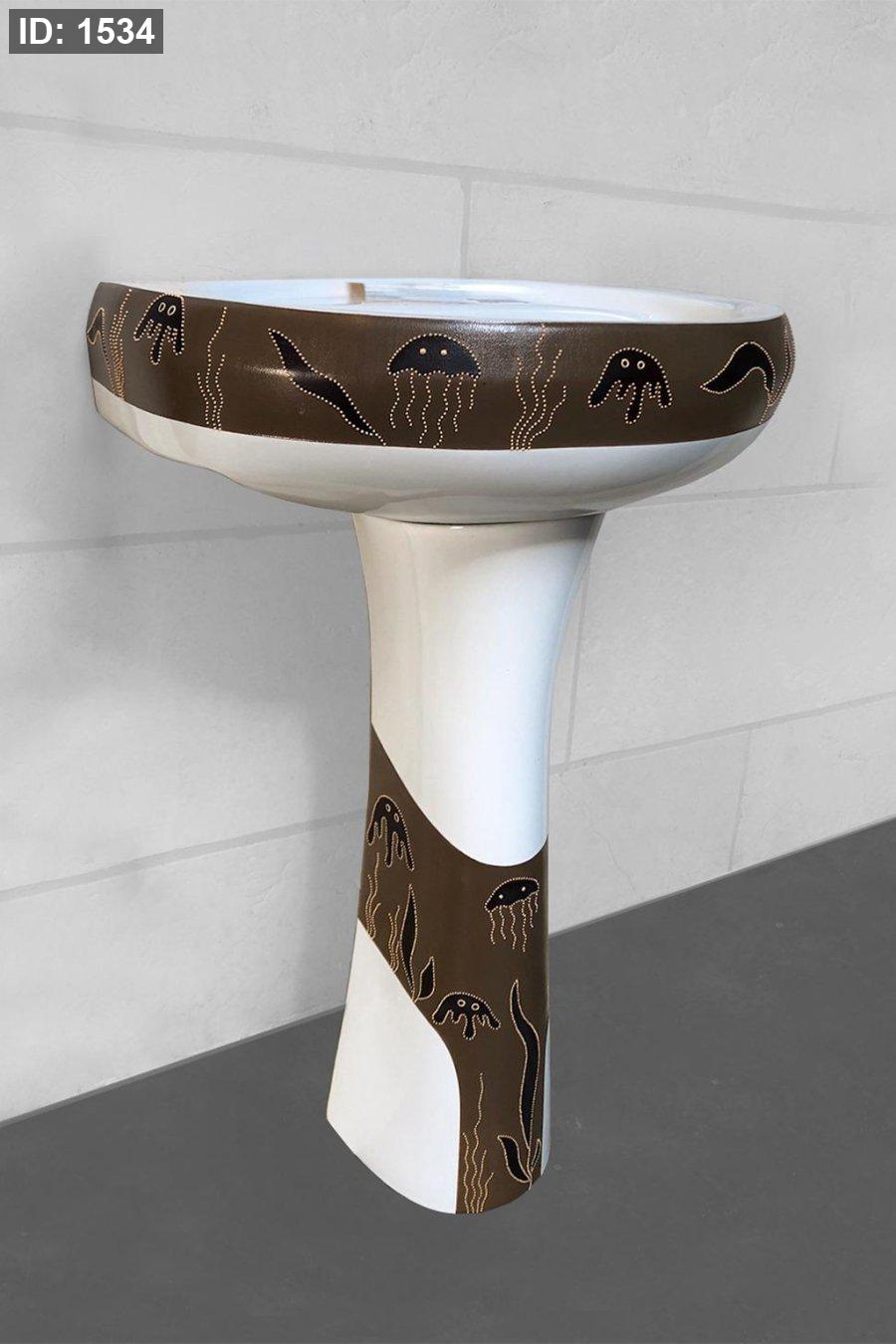 مغسل سيراميك أبيض مزخرف بنقوش بحرية بلون بني داكن، يجمع بين الجمال والتميز بتفاصيل فنية مستوحاة من عالم البحر.