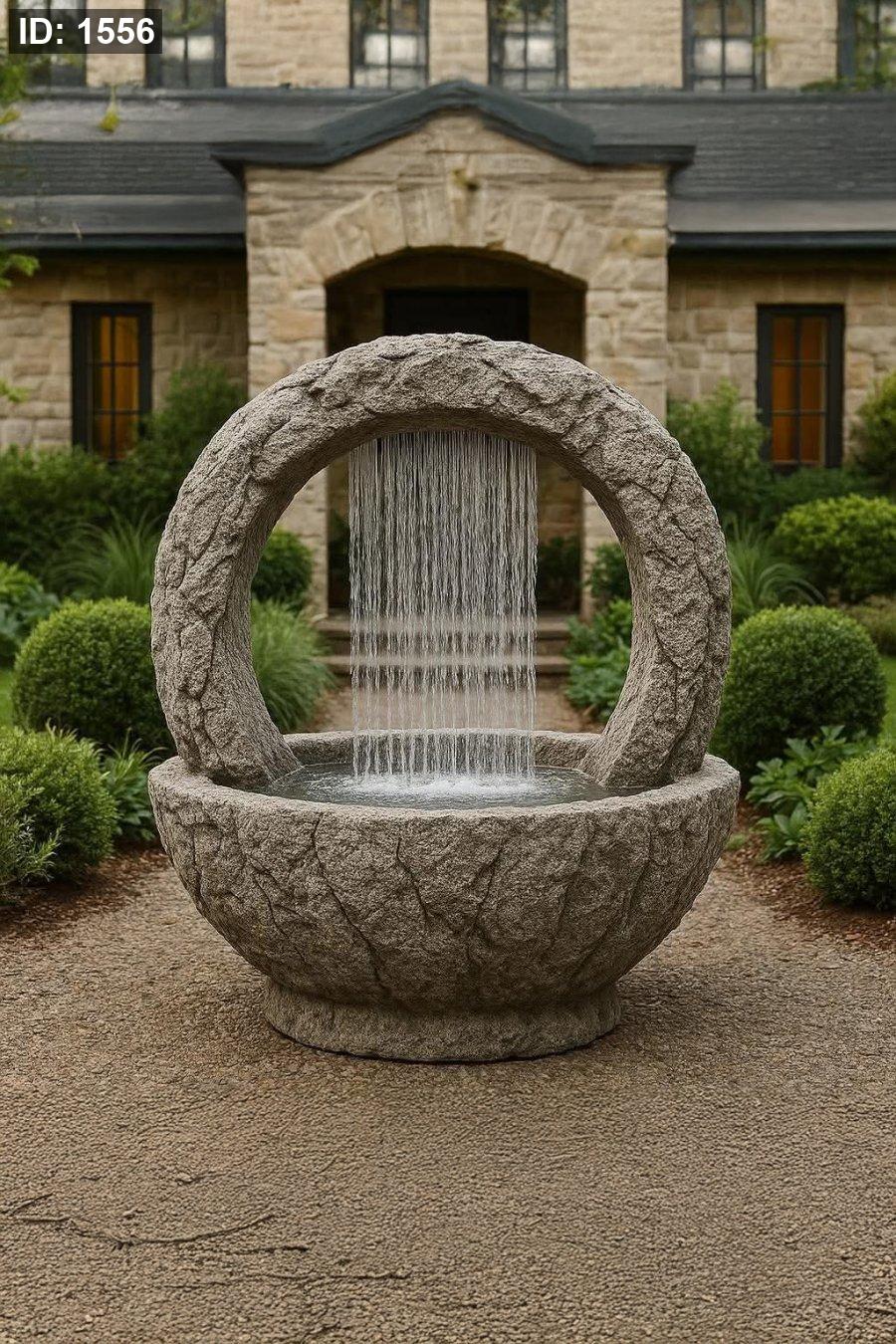 نافورة عصرية بتصميم حلقي فريد، مصنوعة من الحجر الطبيعي، تنساب منها المياه بهدوء لتمنح المكان مظهراً راقياً وإحساساً بالهدوء والاسترخاء.
