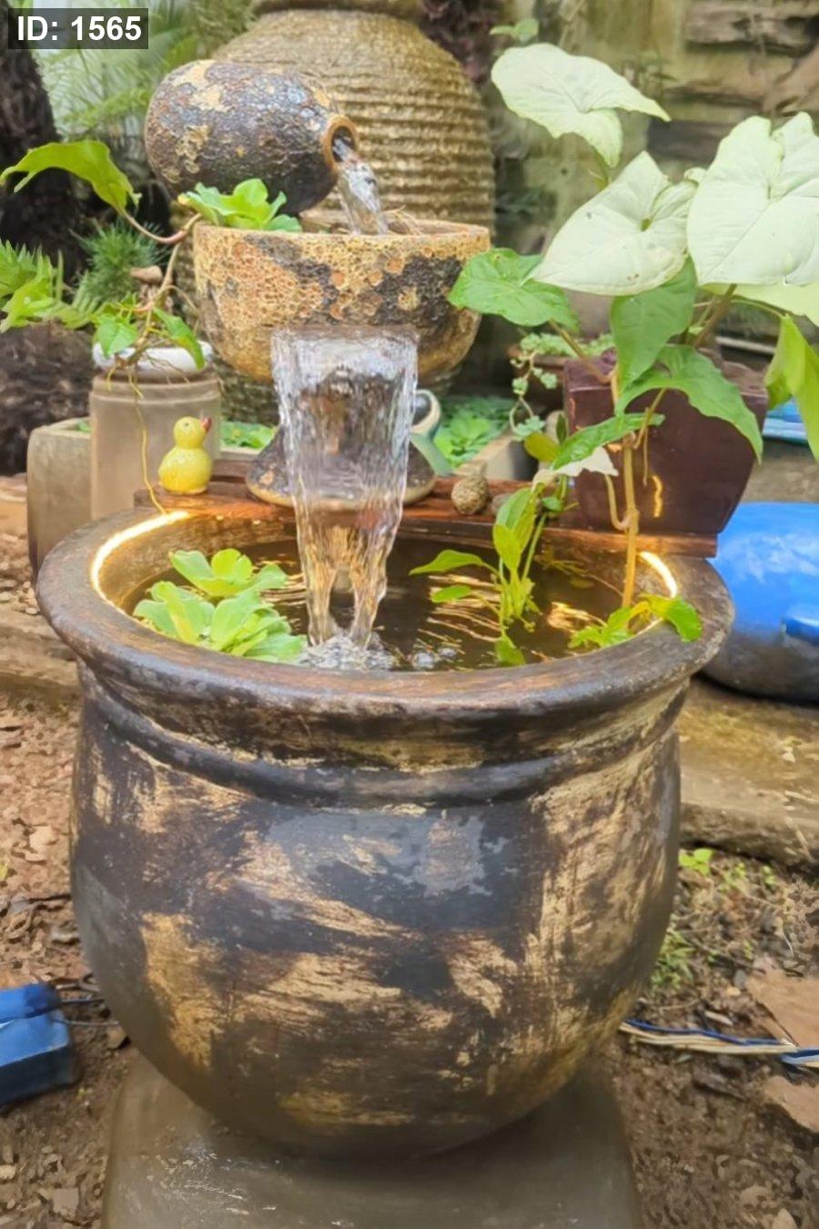 🌾 نافورة فخارية ريفية بإضاءة ونباتات طبيعية
