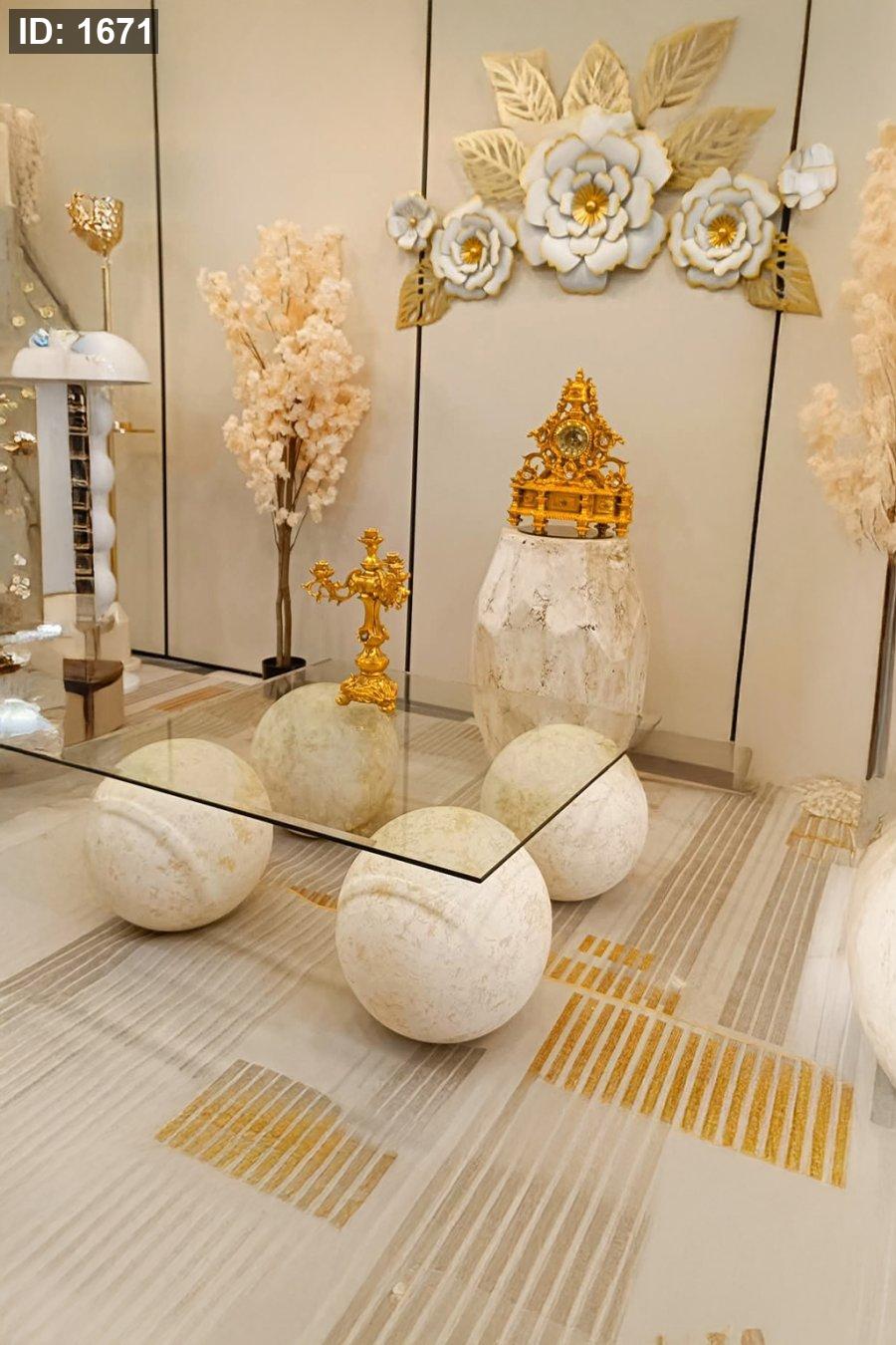 طاولة فاخرة بتصميم يجمع بين القوة والجمال، ترتكز على أربع قواعد كروية من الحجر الطبيعي، مع سطح زجاجي مستقيم يمنحها حضورًا راقيًا يناسب القصور والمجالس الفخمة.