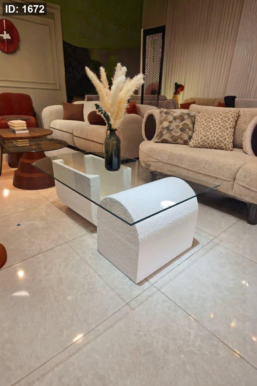 تصميم عصري أنيق يجمع بين الجرأة والبساطة، بسطح زجاجي مستطيل يرتكز على قاعدتين نصف أسطوانيتين بلون أبيض مطفي يضفي لمسة راحة وفخامة على الديكور.
