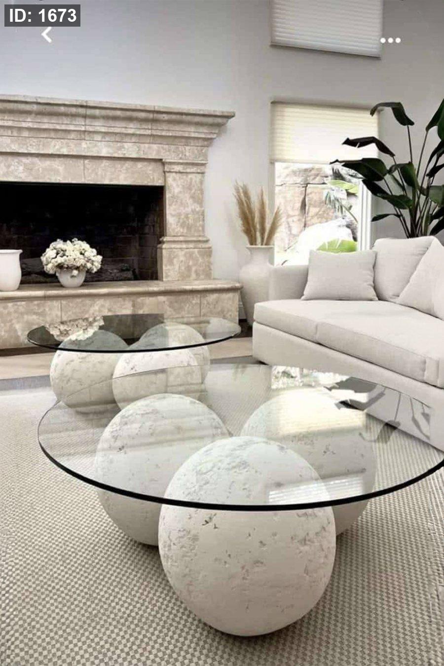 ⚪ طاولة زجاجية بثلاث قواعد كروية من الحجر الطبيعي
