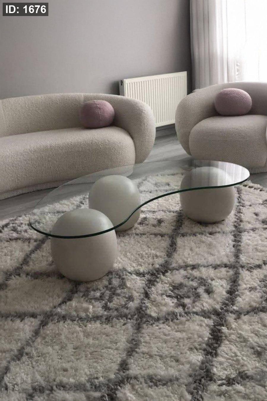 ⚪ طاولة زجاجية بثلاث قواعد كروية من الحجر الفاتح
