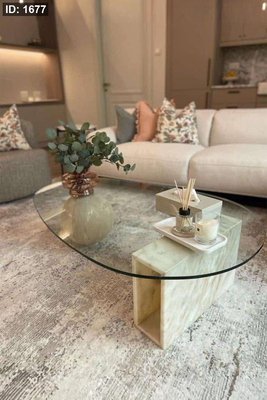 طاولة تجمع بين الرقي والبساطة، بسطح زجاجي شفاف وقاعدة هندسية من الرخام الطبيعي الفاتح. تضيف لمسة فنية راقية لأي مساحة معيشة حديثة.