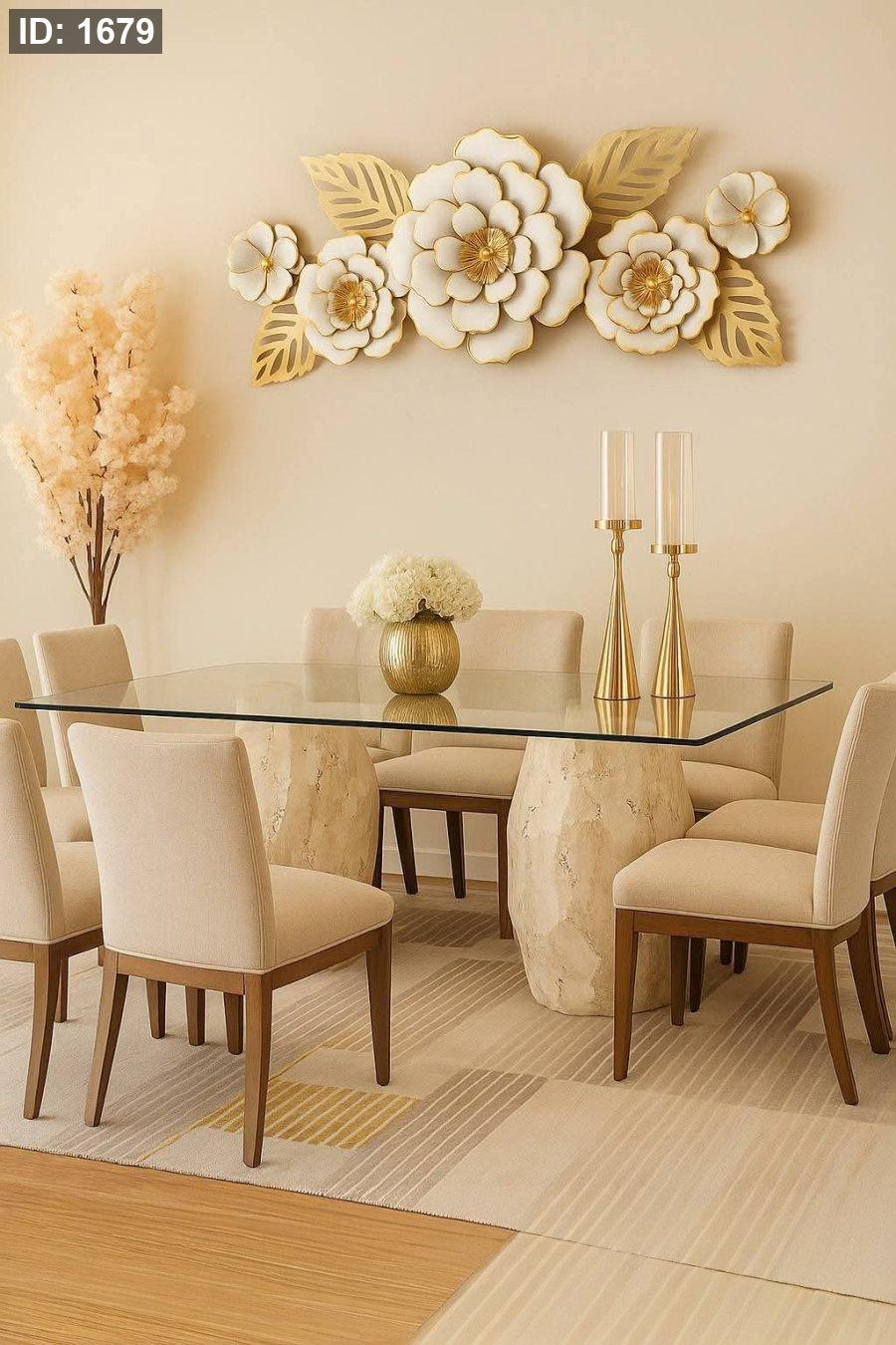 طاولة طعام أنيقة تجمع بين الطابع العصري والفخامة الكلاسيكية، مع سطح زجاجي مستوي وقاعدتين من الحجر الطبيعي المصقول، لتمنح المكان دفئاً وأناقة متوازنة.