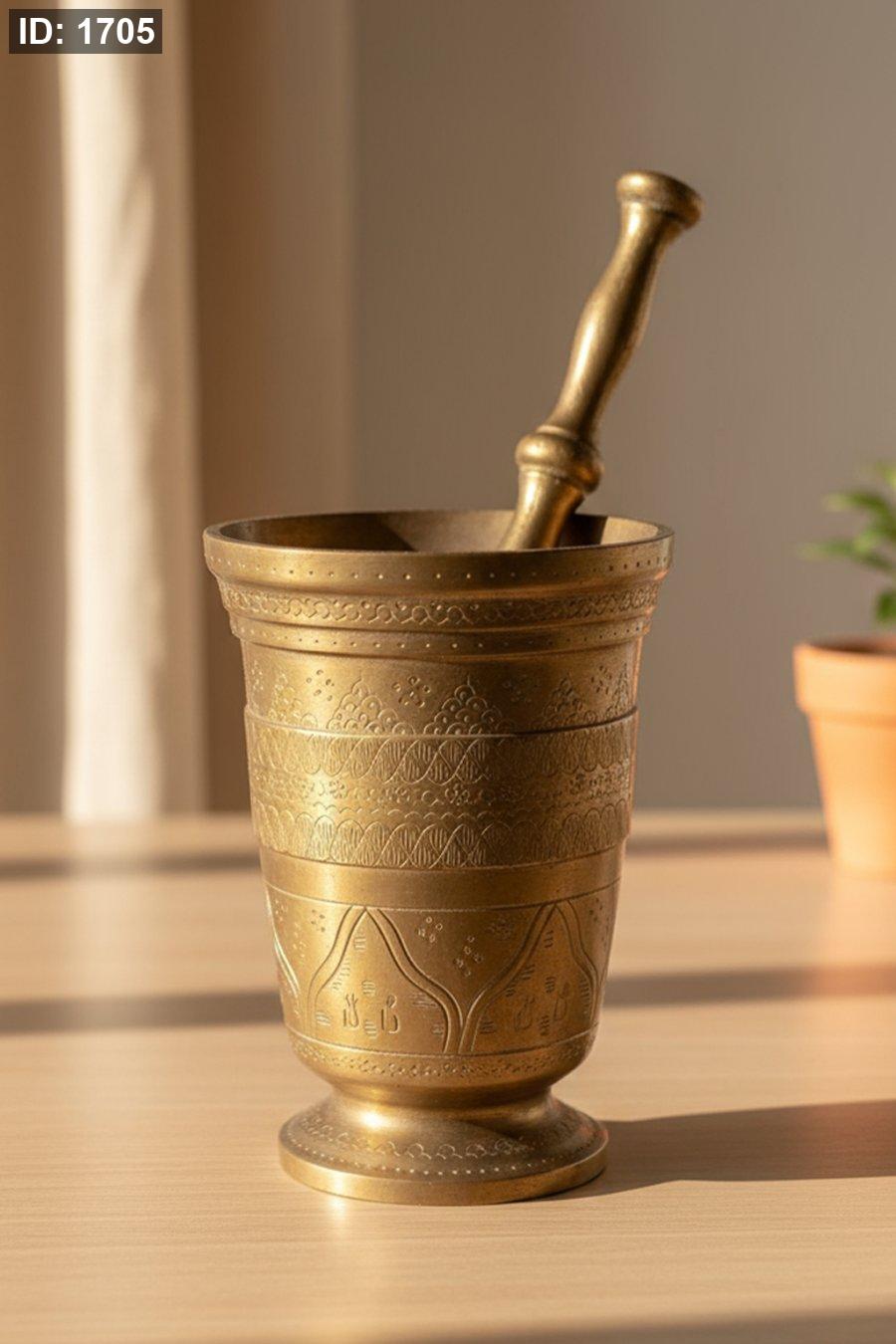 مدقّة نحاسية منقوشة يدويًا بتصميم عربي تراثي أصيل، تجمع بين اللمسة الكلاسيكية والفخامة المعدنية، مثالية لديكور الصالون أو ركن الضيافة العربي.