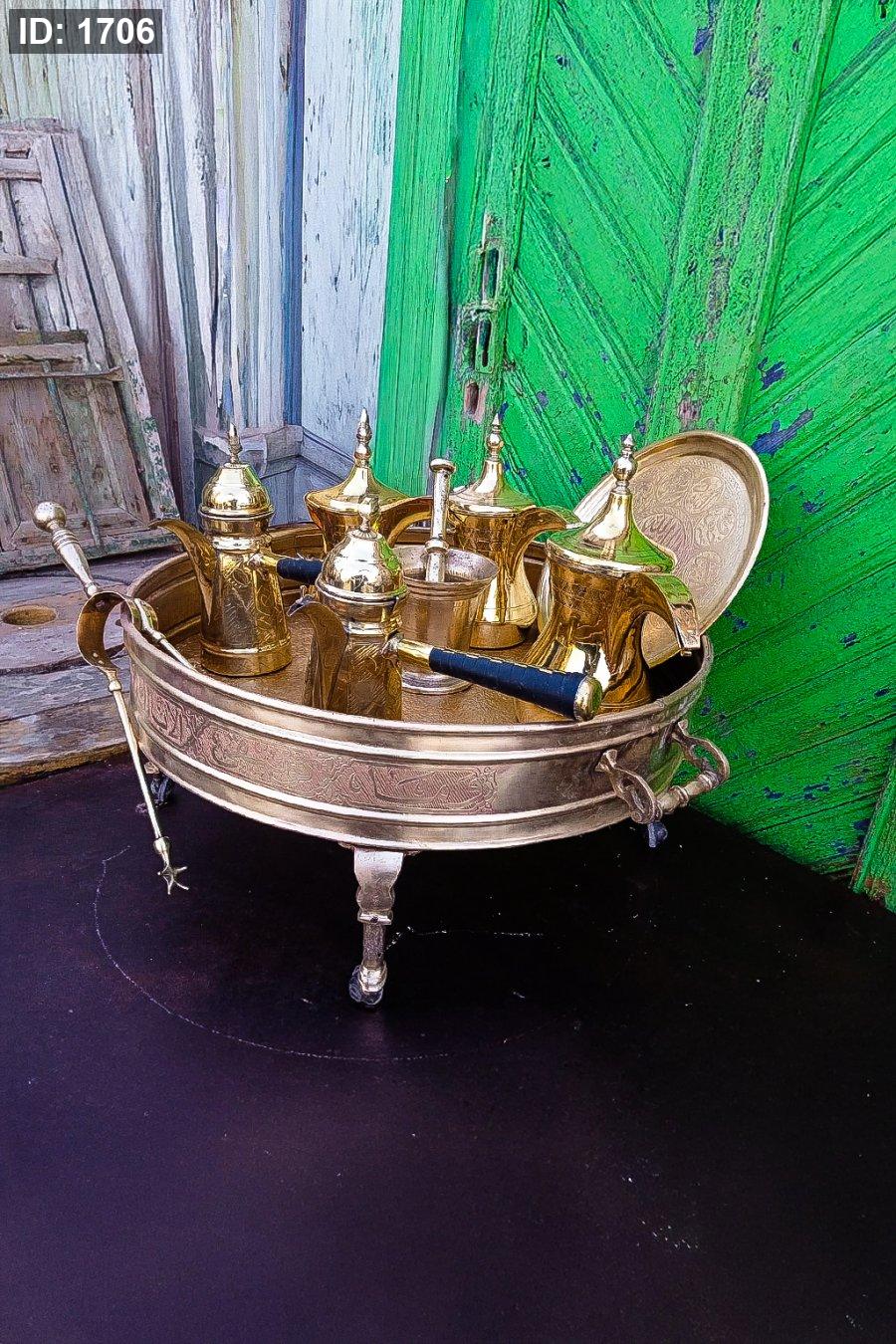 طقم فاخر من دلال القهوة العربية مصنوع من النحاس الأصلي، منقوش يدويًا بتفاصيل دقيقة ويأتي على صينية مرتفعة بثلاث أرجل، يجسّد كرم الضيافة العربية والأصالة التراثية في أبهى صورها.