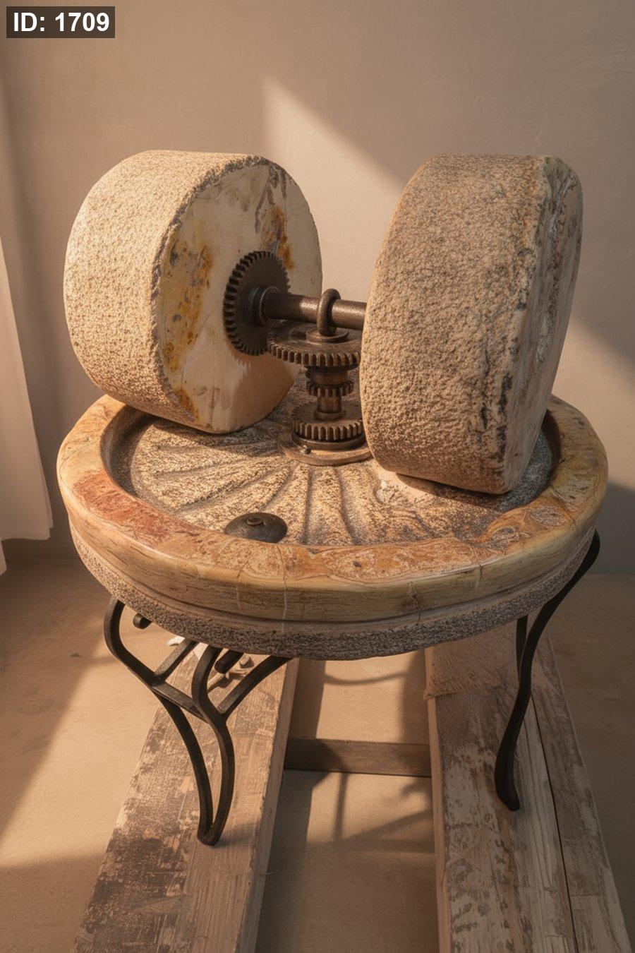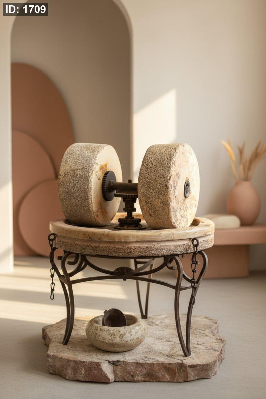 مطحنة زيتون تراثية بتصميم مزدوج، تجمع بين الحجر الطبيعي والهيكل المعدني، تعبّر عن جمال الحِرفة القديمة وتُعد قطعة ديكور فريدة تمزج بين الأصالة والفخامة.
