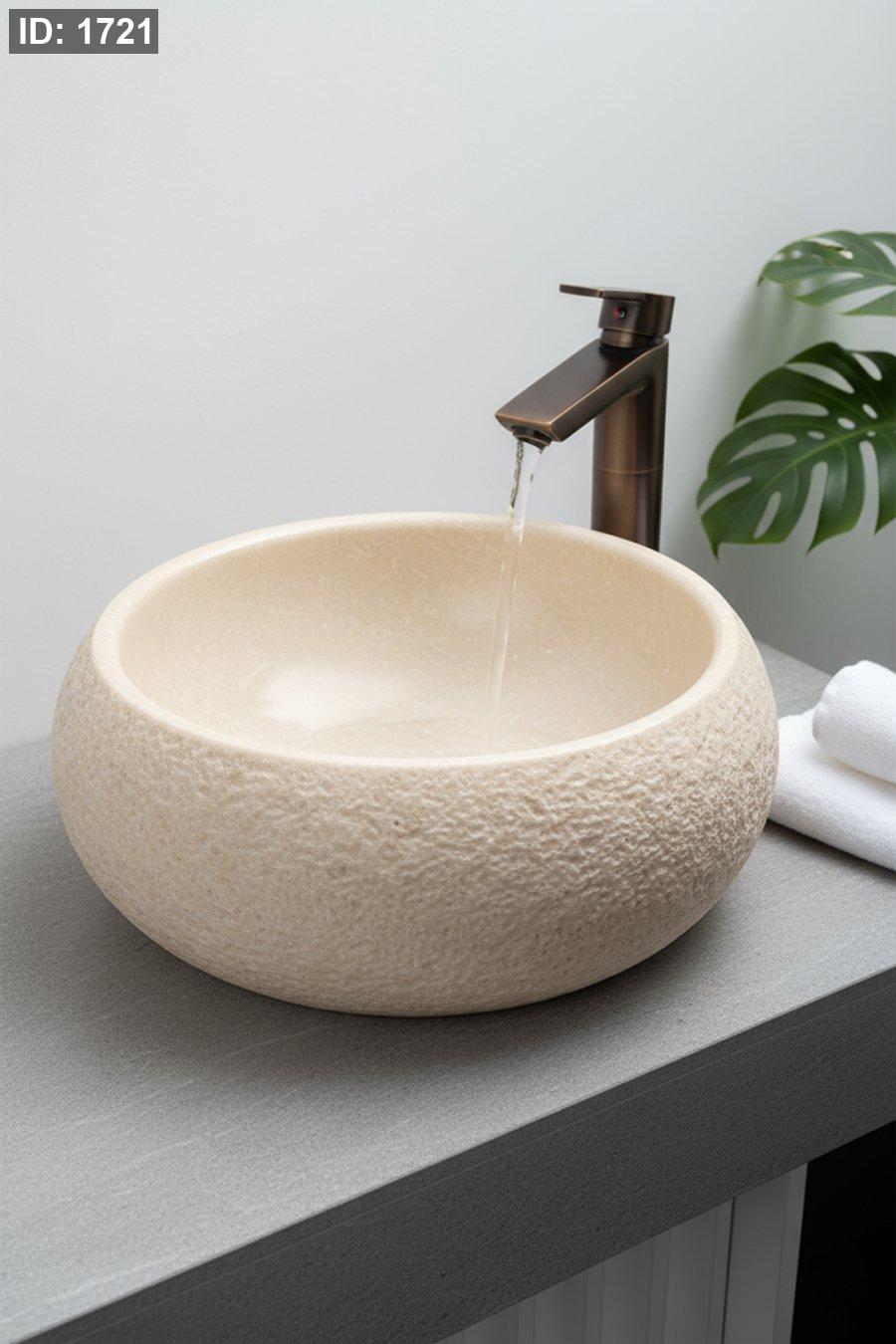 حوض مغسلة أنيق مصنوع من الحجر الطبيعي بلونه الكريمي، تصميم دائري ناعم يدمج الفخامة والبساطة في أي حمّام عصري.
