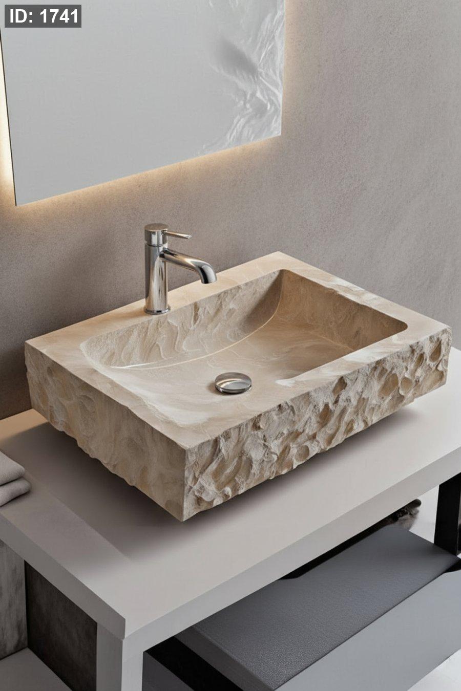 حوض مغسلة مستطيل من الحجر الطبيعي بملمس خام على الحواف وتشطيب داخلي مصقول، يجمع بين الصلابة والفخامة ليكمّل ديكور حمّامك العصري.