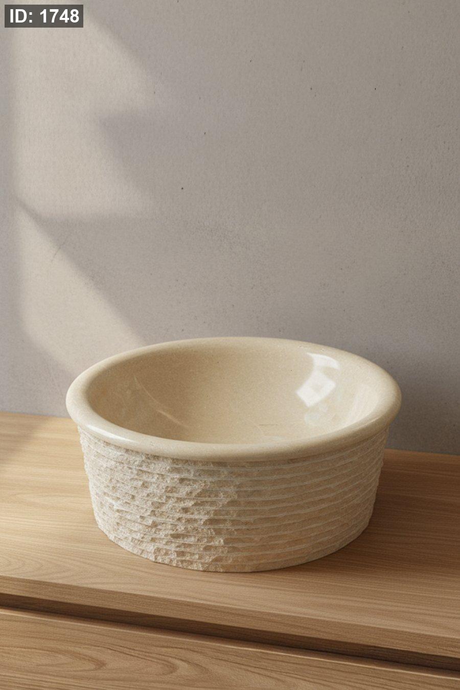 حوض مغسلة من الحجر الطبيعي بنقشة جانبية ناعمة ولون بيج ذهبي، تصميم عصري وأنيق يضيف لمسة فخمة إلى الحمّام.