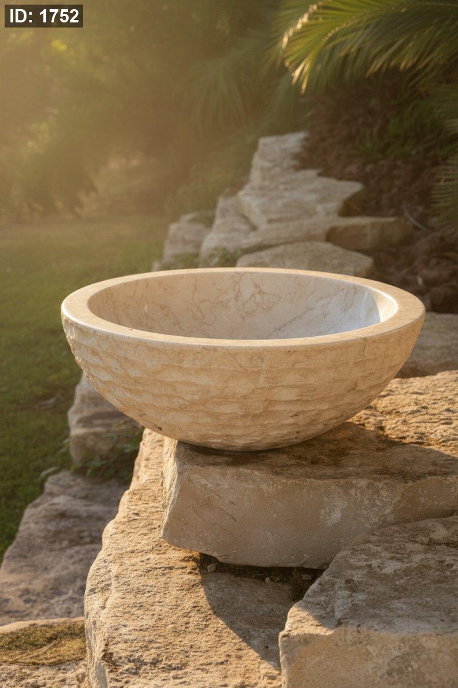 حوض مغسلة من الحجر الطبيعي بلون كريمي فاتح وملمس خارجي محفور بدقة، يجمع بين البساطة والجمال الطبيعي الفاخر.