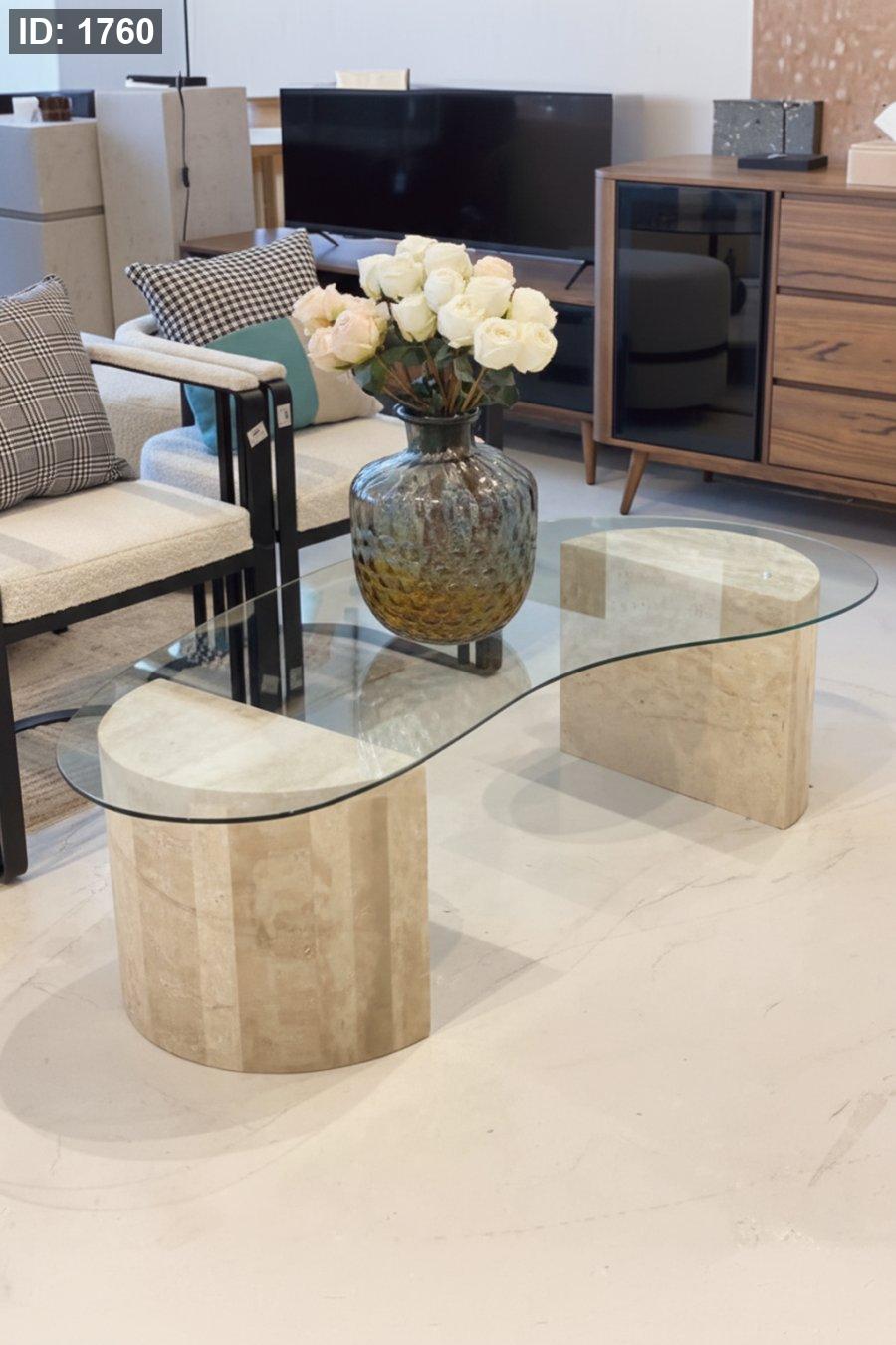 طاولة فخمة تجمع بين الزجاج الشفاف والحجر الطبيعي بتصميم منحني مميز يضفي لمسة أنيقة على أي مساحة داخلية.