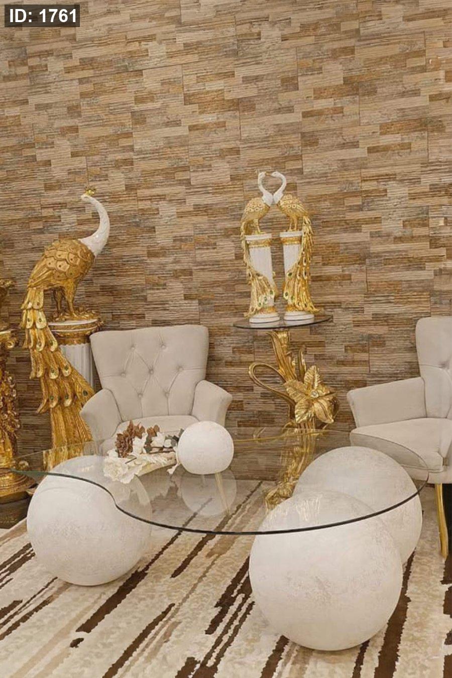 طاولة أنيقة بثلاث قواعد كروية من الحجر الطبيعي، تجمع بين التصميم العصري والفخامة الكلاسيكية لتضفي لمسة مميزة على أي مجلس أو صالة استقبال.