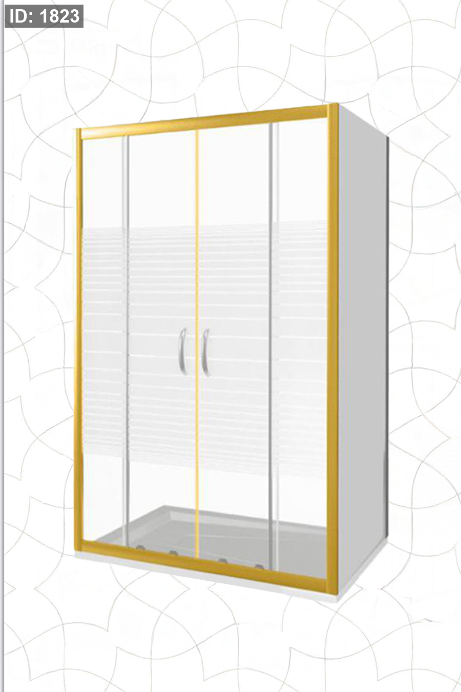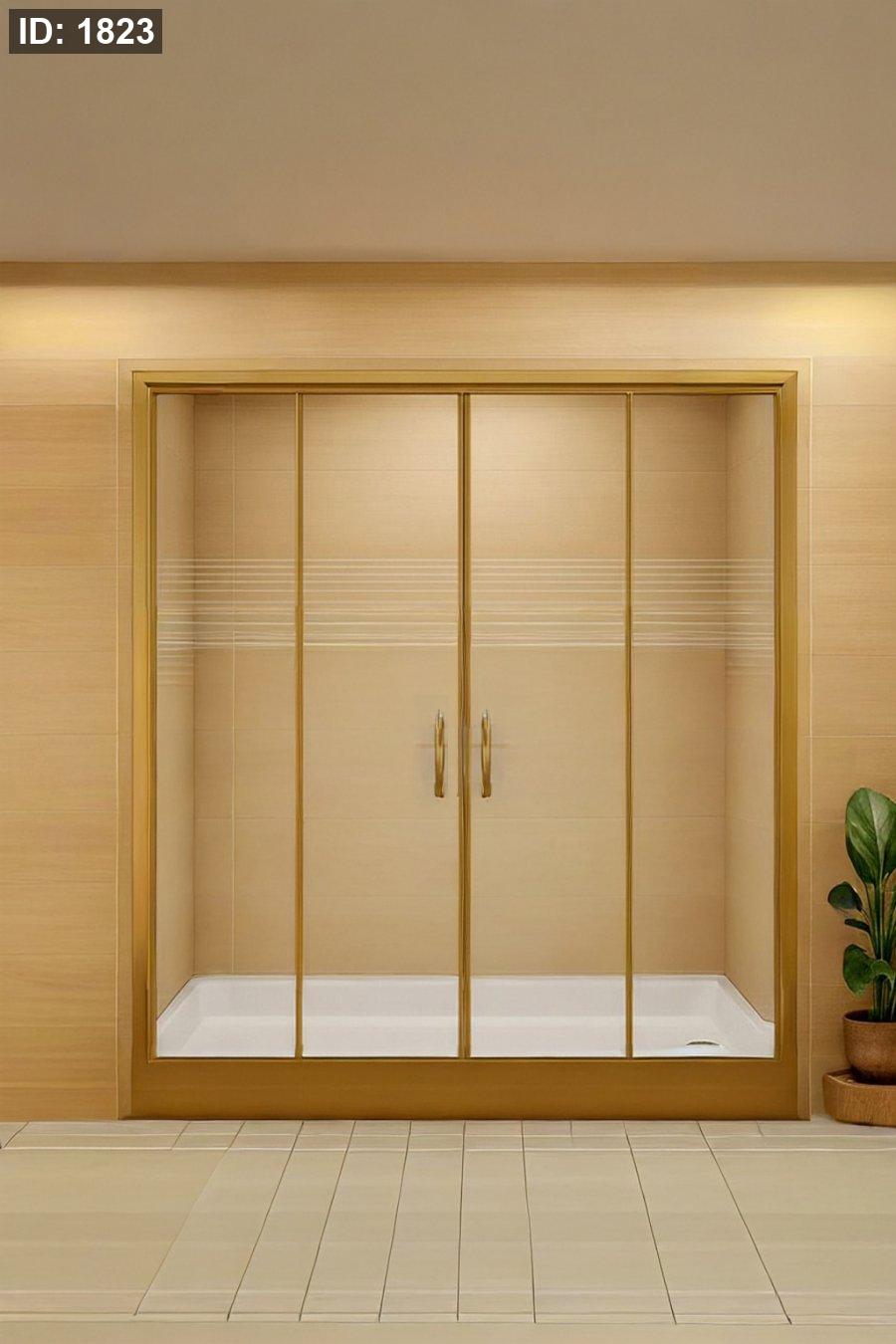 واجهة دش بعرض كامل بين جدارين، فريم جولد فاخر مع خطوط Privacy رفيعة في الوسط، وأبواب سحّاب بحركة ناعمة.