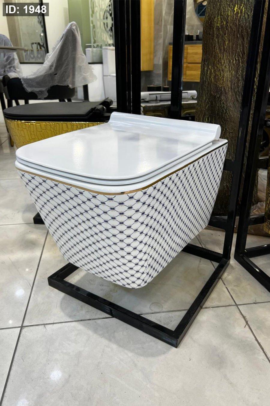 مرحاض تعليق بنقشة هندسية – تصميم أبيض مزخرف بالأسود