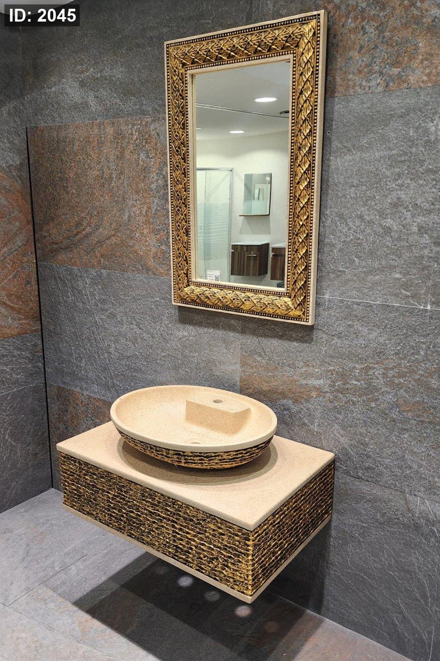 حوض دائري بلون بيج حجري مع زخارف ذهبية محيطة.