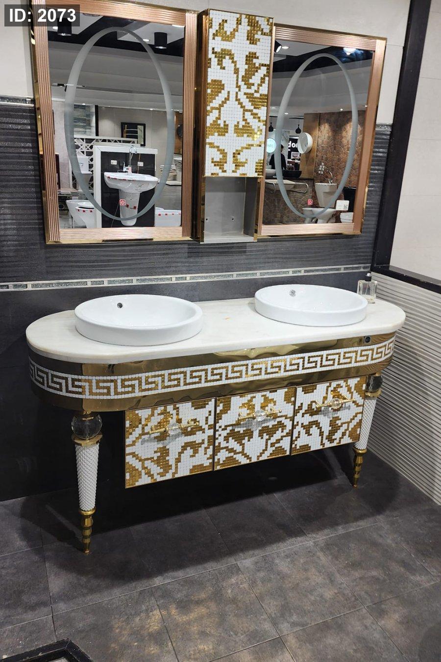 مغسلة سيراميك مزدوجة بتصميم فاخر يجمع بين اللمسات الكلاسيكية والزخارف الذهبية اللامعة. مثالية للحمامات الواسعة والراقية، وتمنح المكان مظهرًا ملكيًا بفضل تفاصيل الفسيفساء واللمسات المعدنية اللامعة.