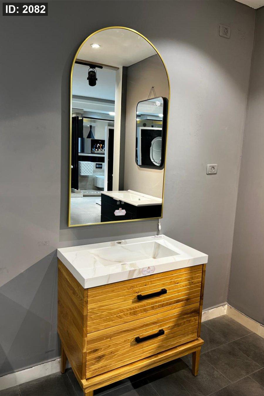 مراية كبيرة بإطار ذهبي تزيد فخامة المكان وتكمل التصميم.