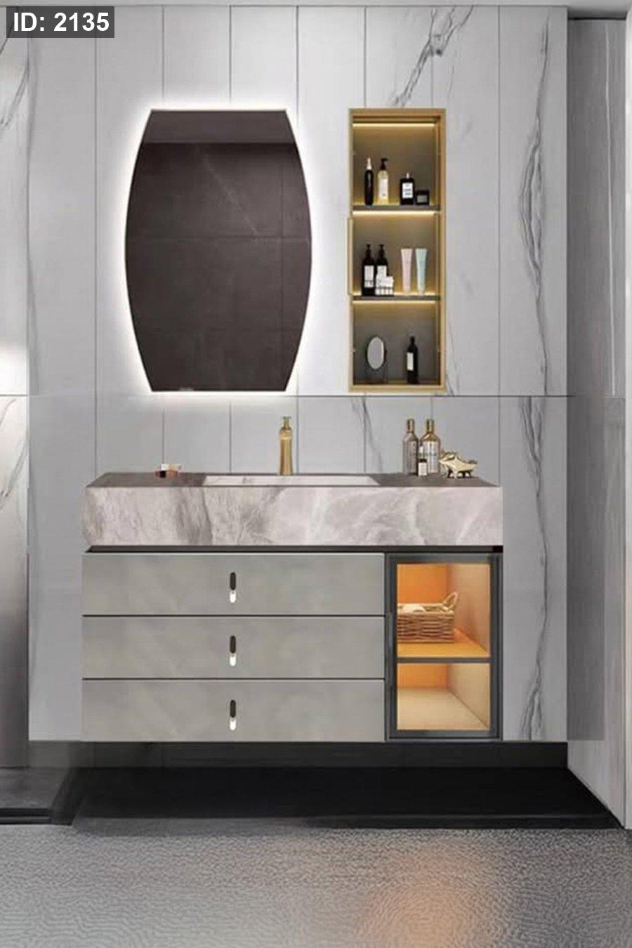 مغسلة بورسلان رخامي بستايل فاخر جداً، تجمع بين السطح الحجري الأنيق والخزانة الرمادية الراقية، مع إضاءة داخلية دافئة في الخزانة الجانبية ومرآة LED تضيف جو مودرن للحمام.