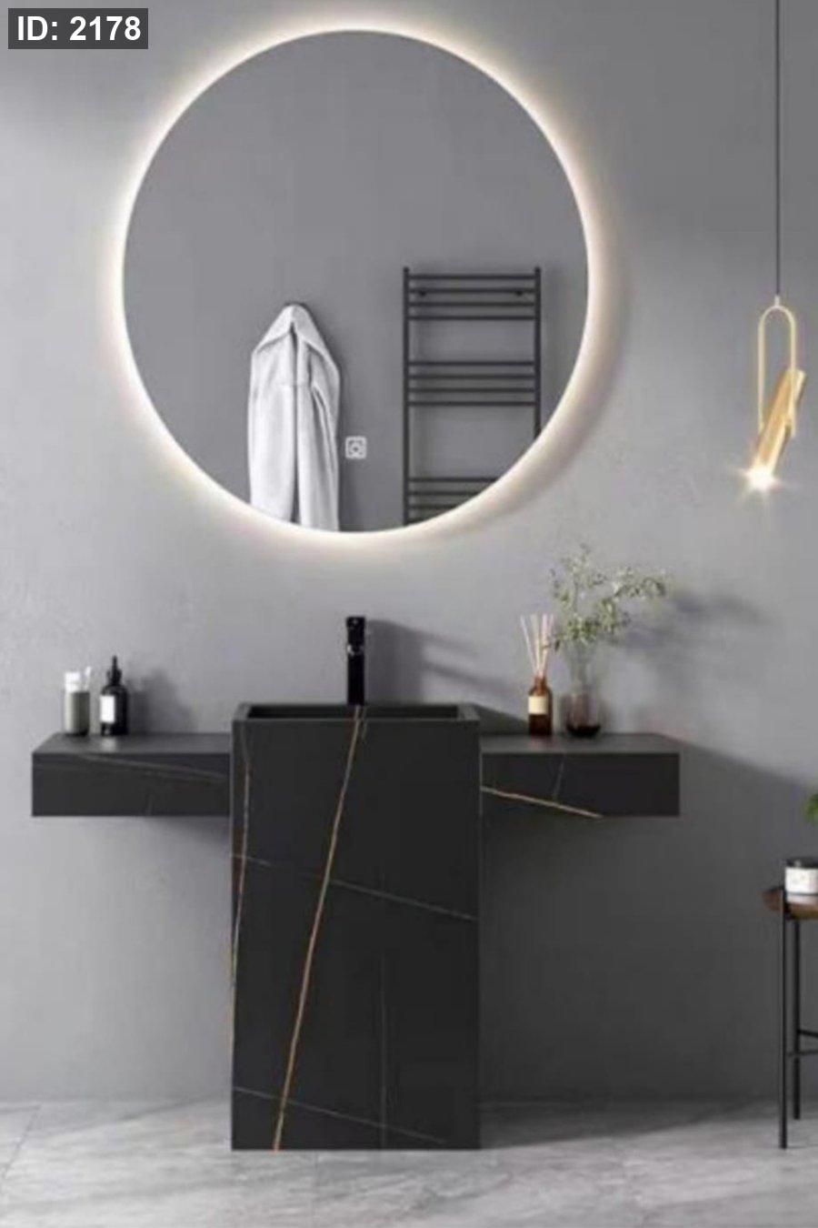 مغسلة حمّام بتصميم راقي من الرخام الأسود مع عروق ذهبية رفيعة، ستاند كامل مع جناحين جانبيين لوضع الأدوات. شكل فاخر ومناسب للحمامات الحديثة، مع مرآة دائرية بإضاءة LED خلفية.