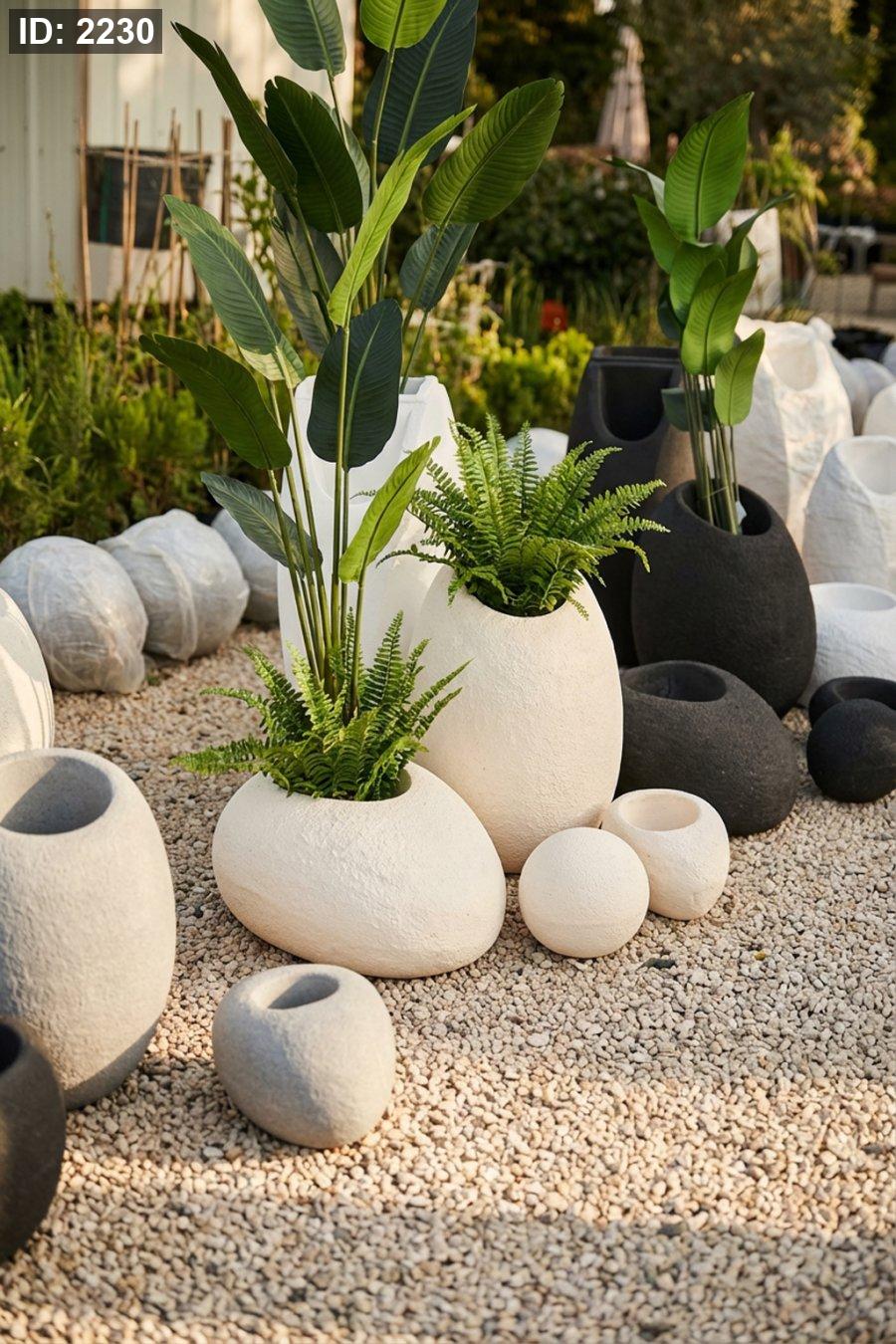 ✅ أشكال متعدّدة: أصيص طويل، أصيص بيضاوي أفقي، وأحجار/كرات ديكورية مكملة للديكور