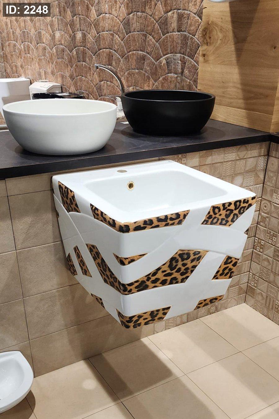 تصميم هندسي حديث مع شرائط زخرفية بنقشة ليوبارد حول جسم المغسلة.