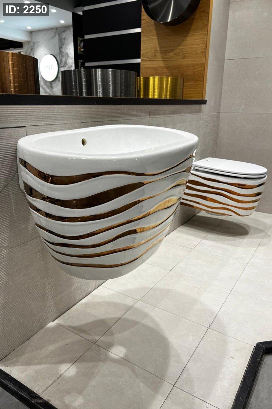 مرحاض ميني بلوك معلق بجدار، نفس النقشة الذهبية المتناسقة مع المغسلة.