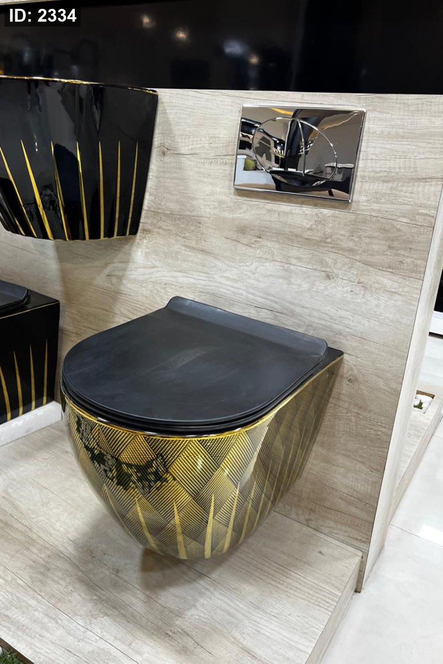 جسم المرحاض مزخرف بنقشة هندسية ذهبية (مربعات وخطوط) تعطي شكل ديكوري مميّز