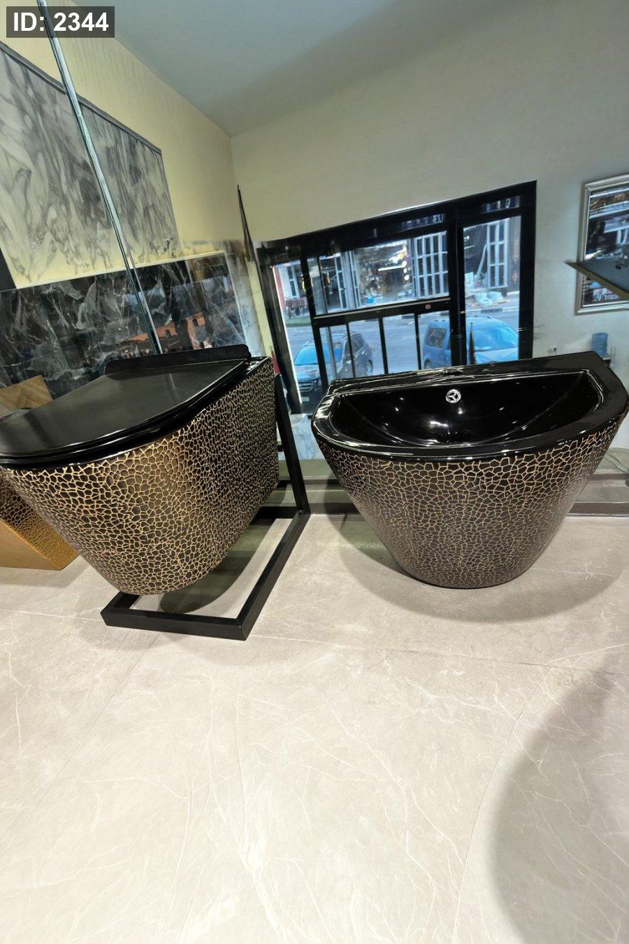 غطاء مرحاض أسود لامع وحوض مغسلة داخلي أسود يعطي تباين أنيق مع النقشة.