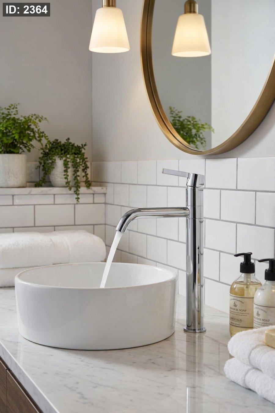 تشطيب كروم فضّي لامع ينسجم مع الأحواض البيضاء والرخام الفاتح.