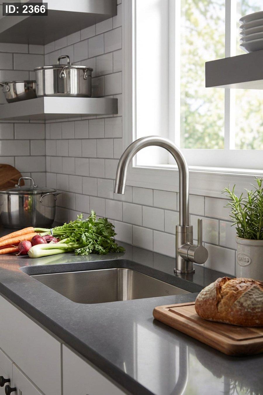 تشطيب فضّي مطفي ناعم ينسجم مع أسطح الجرانيت والرخام الفاتح والغامق.