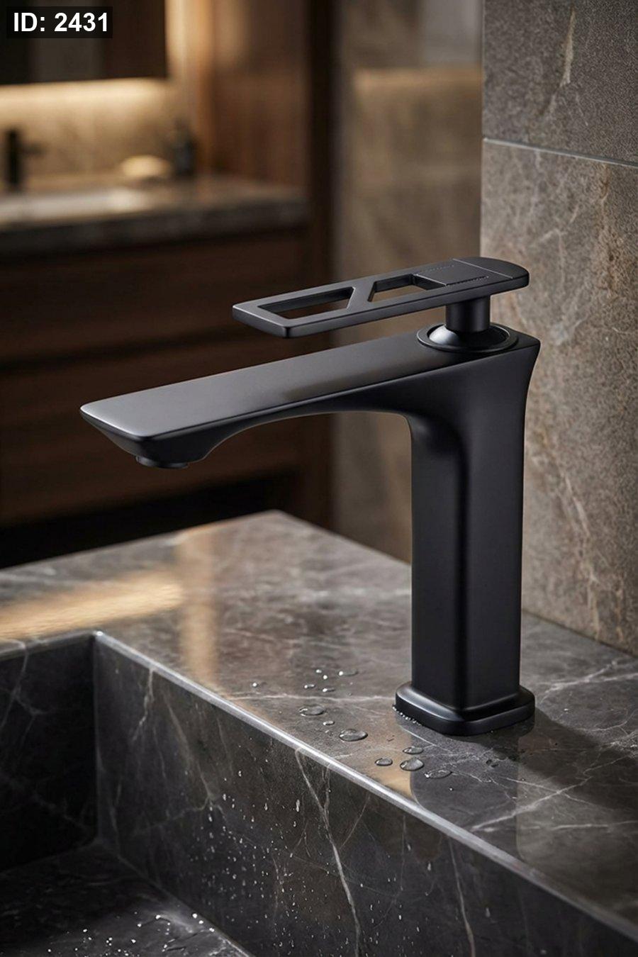 تصميم هندسي فخم—أسود مطفي مع ذراع تحكم عصري للمغسلة.