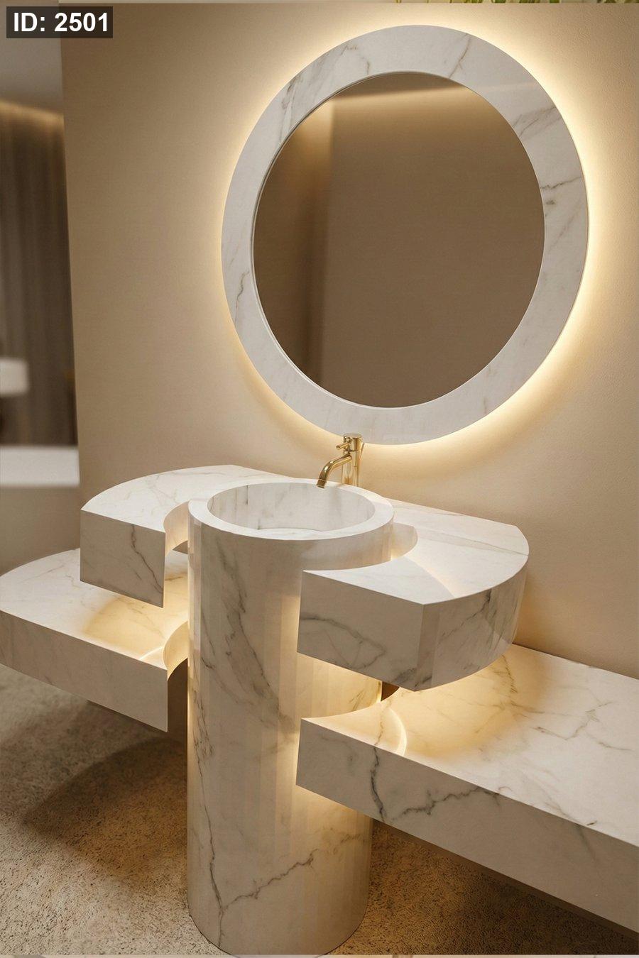 ✅ تصميم هندسي مميز: حوض دائري مدمج مع طاولة جانبية نصف دائرية