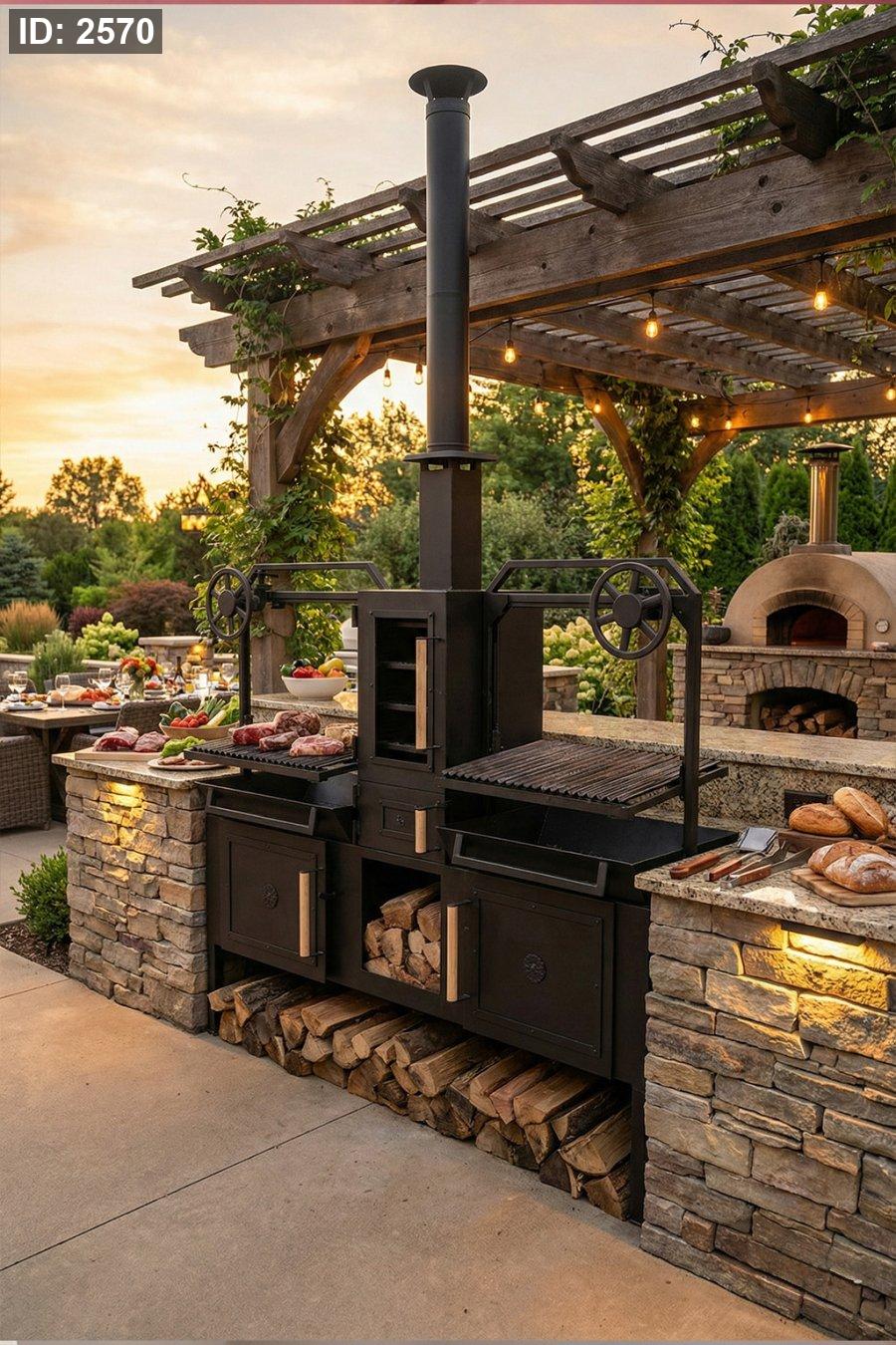 مطبخ خارجي متكامل بطول 2 متر: جريل على الجهتين + فرن مدخّن بالنص 4 رفوف + خزائن سفلية وتخزين حطب… جاهز للعزائم والشغل الثقيل.