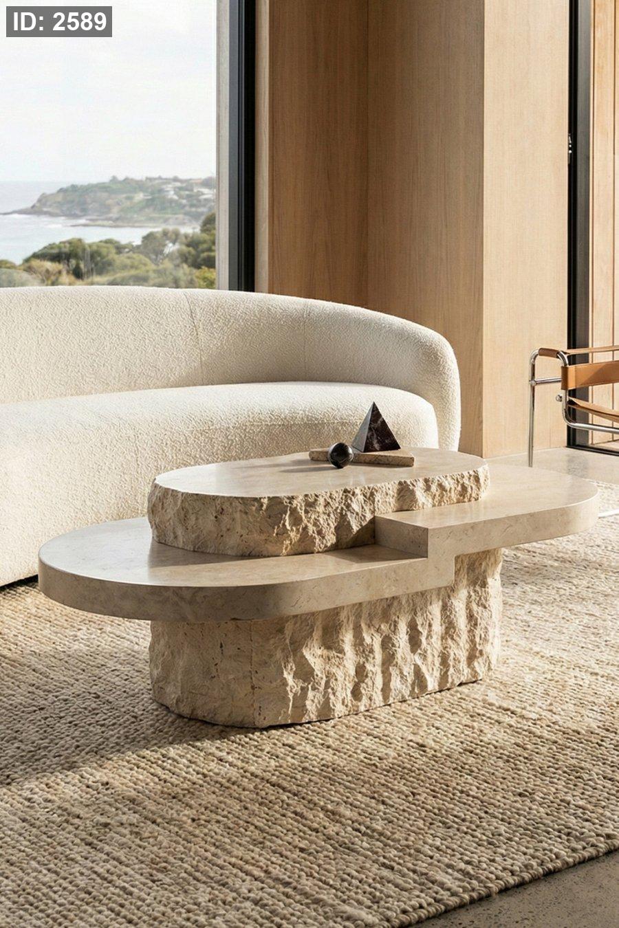طاولة وسط فخمة من الحجر الطبيعي—قطعة واحدة بتصميم طبقتين أنيق ولمسة خامة محفورة تعطي شكل مودرن راقي.