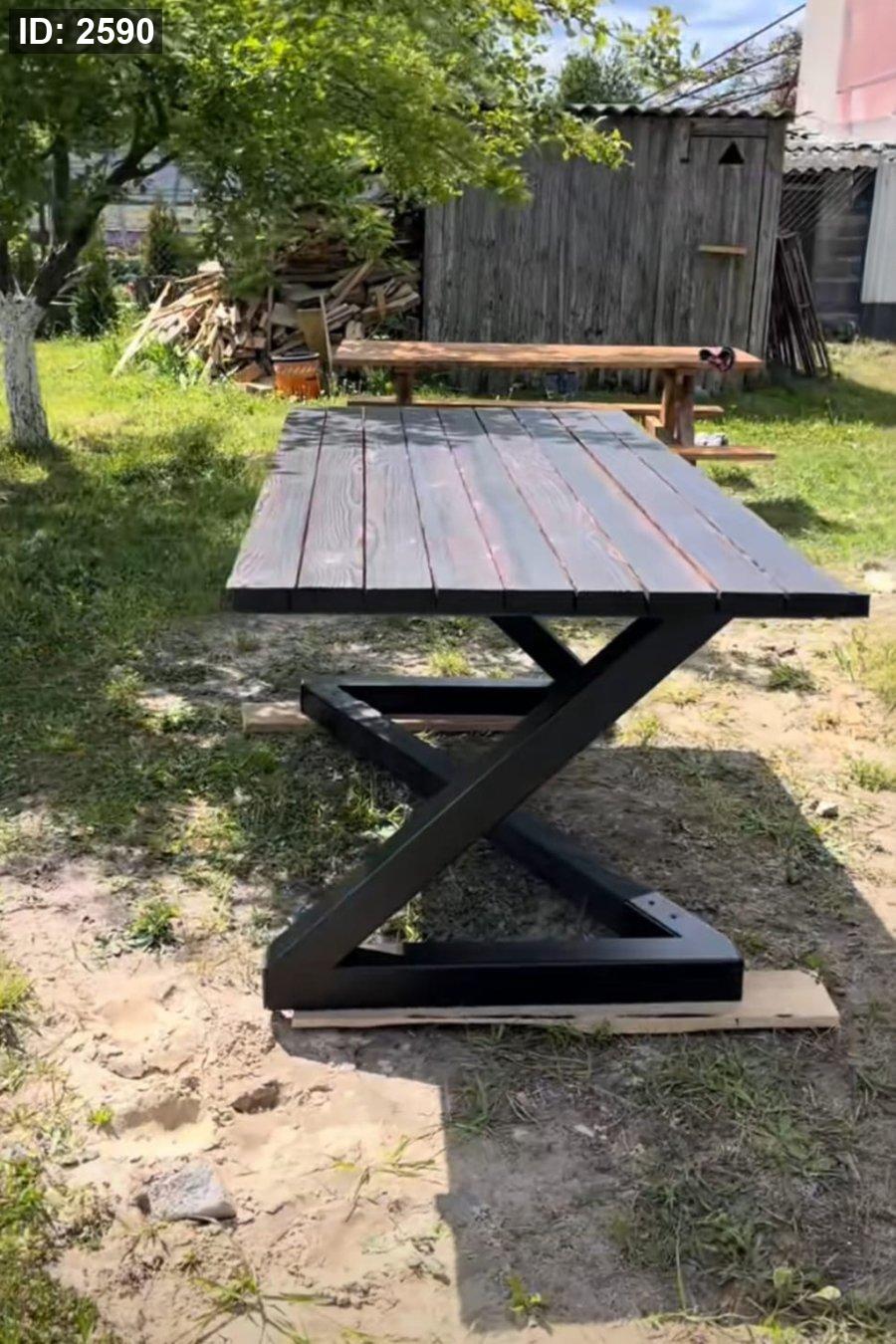 طاولة مودرن بقاعدة حديد شكل X مع سطح خشب قوي—ثبات عالي وشكل فخم للحديقة أو الجلسات الخارجية.