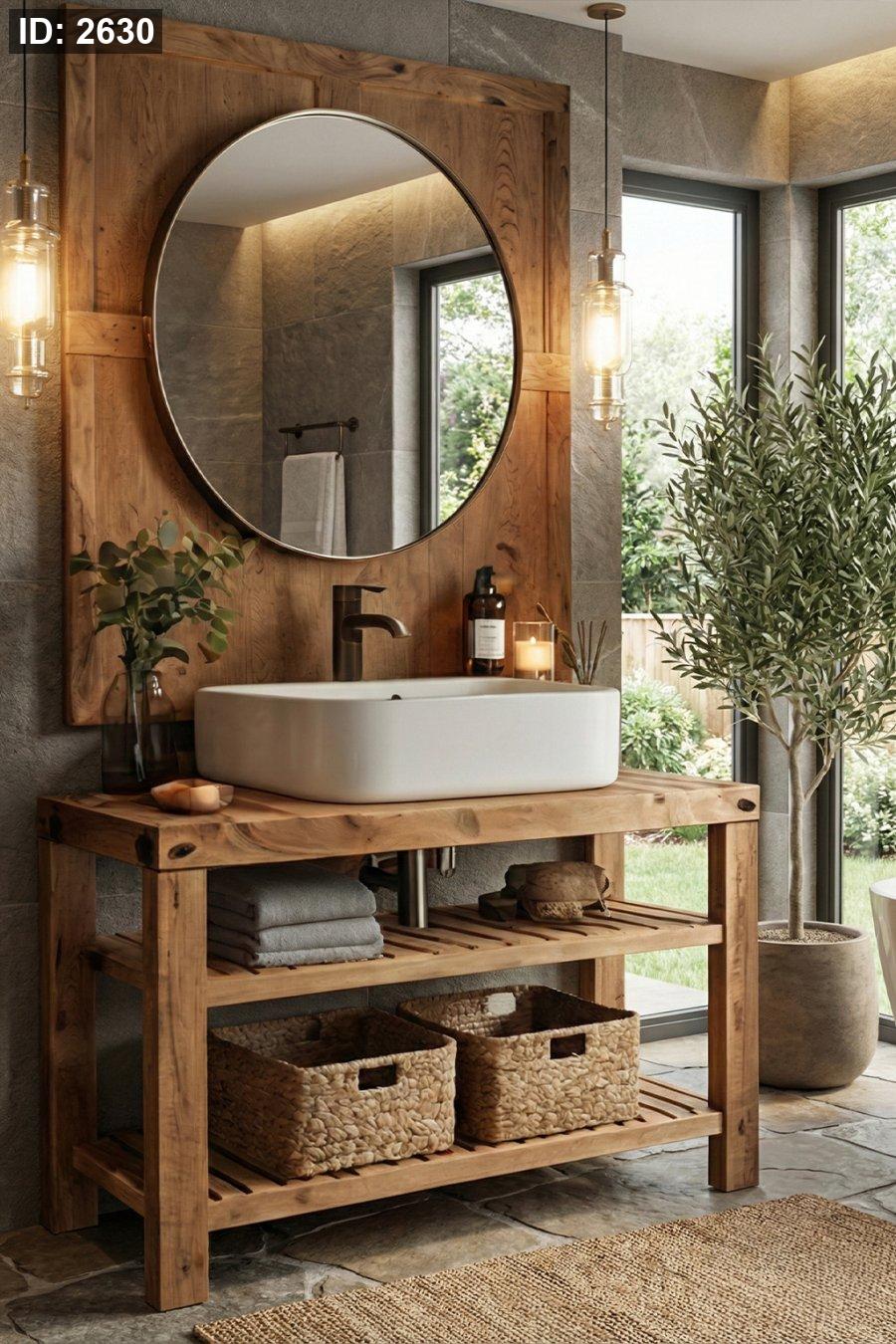 متوفر خدمة التوصيل لجميع المناطق — مغسلة خشب ريفي مع مراية دائرية ولوح خشبي خلفي، رفّين للتخزين وترتيب الأغراض.