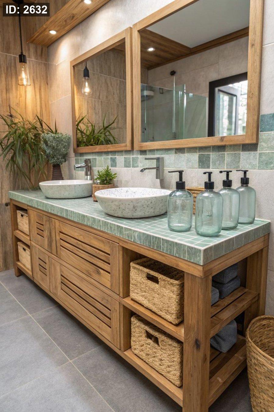 متوفر خدمة التوصيل لجميع المناطق — مغسلة خشب بحوضين علويين وسطح سيراميك/موزاييك، مع أدراج وخزائن ورفوف جانبية بسلال.