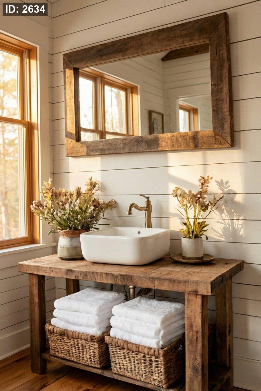 مغسلة خشب ريفية بحوض حجر مع تخزين جانبي