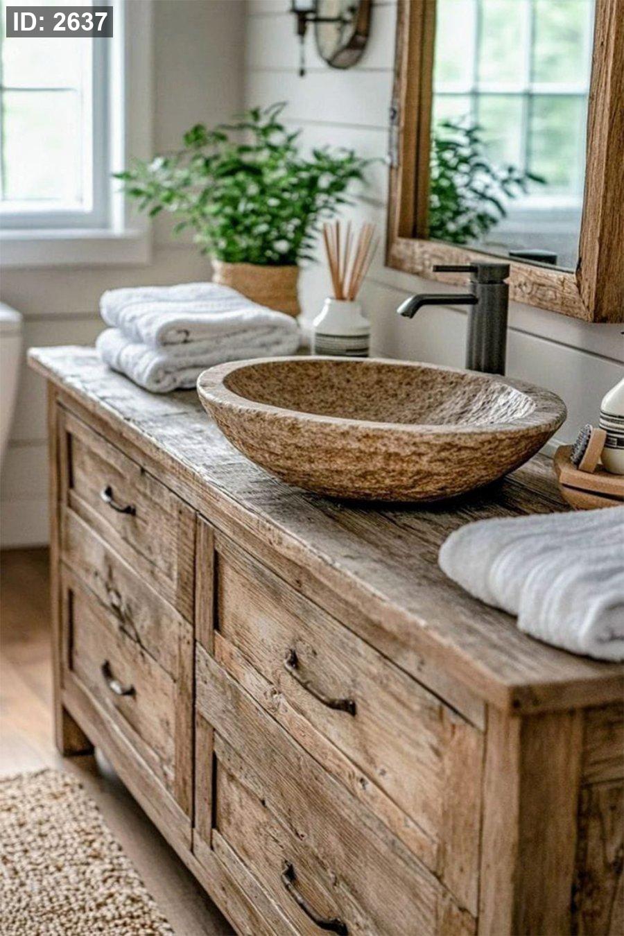 مغسلة خشب ريفية بحوض حجر مع تخزين جانبي
